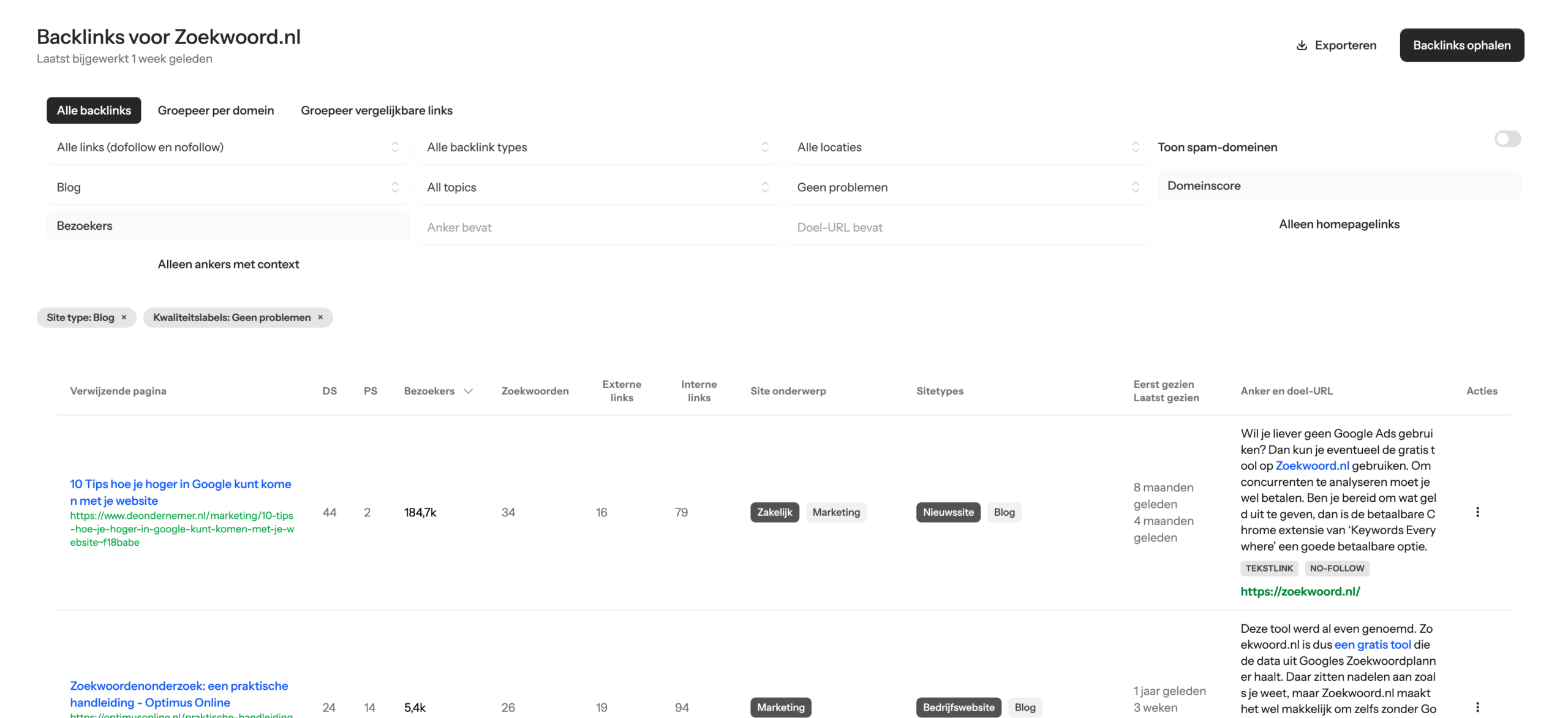 Binnen de tool kun je ook gewoon alle links bekijken en daar uitgebreid op filteren.